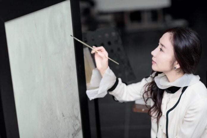 trama incompiuta, l’immagine volutamente incompleta, è una precisa scelta dell’artista. Non mancano riferimenti a una pittura più costruita e dai contorni meno rarefatti, come osserviamo soprattutto nei dipinti dove è prevalente l’adesione alla pittura tradizionale cinese. Nella tradizione cinese il vuoto esprime la spiritualità e l’energia interiore ed è un elemento ricorrente nella sua pittura: esso non è assenza bensì possibilità, uno spazio aperto che invita lo spettatore a completare l’immagine con la propria esperienza. Lo spazio bianco, la porzione non risolta dell’immagine, non si offre pienamente ma si apre verso l’esterno come un quesito, una domanda rivolta all’osservatore. In questo senso, il lavoro dell’artista si configura come un invito alla partecipazione e all’ascolto.