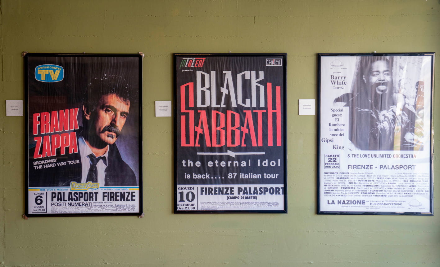 Gli appassionati di memorabilia musicale, tra i 200 manifesti, potranno trovare autentiche rarità, come i manifesti delle tappe fiorentine di Ray Charles nel 1985, di Vasco Rossi e di Liza Minnelli nel 1987, di James Brown nel 1988, di Paul McCartney nel 1993. E ancora Eric Clapton (1987 e 2001), Luciano Pavarotti (1990), Peter Gabriel (1993), Neil Young (2008), Bob Dylan (2009, 2011 con Mark Knopfler e 2018) e poi i tanti live dei fiorentini Litfiba, Bandabardò e Marco Masini.