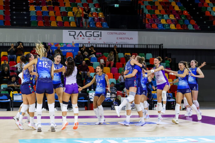 Nel terzo rimangono in campo Williams e Kump – e anche Sirressi che nel frattempo aveva preso il posto di Recchia come libero – e il match è più equilibrato, con un continuo ribaltamento di fronte punto a punto che sul 9-10 (incomprensione in ricostruzione) porta Chiavegatti a fermare il gioco: sull’11-12 entra Markovic per Williams, sul 12-12 c’è Fiesoli per Gardini, poi sul 14-13 c’è Bertolino in seconda linea per Knollema, e il muro di Villani vale il primo break (15-13) e il conseguente time out di Giovi. Zuccarelli (sei punti nel set con due muri) allunga ancora con un altro pallonetto (18-15), Giovi inserisce Turlà in regia per Ricci e Fiesoli accorcia (19-18), poi Markovic impatta (20-20) ma Knollema da campionessa mette giù due attacchi di fila (22-20) e Giovi ferma il gioco, rimettendo anche in campo Gardini per Fiesoli: al rientro Bartolini sbaglia il primo tempo (23-20), rientra anche Ricci per Turlà e Malesevic procura tre match point (24-21), sul secondo dei quali è Villani a far esplodere la festa (25-22).